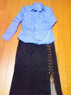シンプルな細身のシャツが欲しかったので買ってみた。 カラーバリエーションがいっぱいあったので、サックスブルーも ついでに購入。特に必要では無かったけど(^_^); これに前から持ってた飾り紐つきデニムスカートを組み合わせたら↓ ほとんどコスプレ。 スカートは本当は真ん中に飾りが 来るデザインなんですけどね。 とりあえず、この組み合わせでは 外出できないな!いかに普通に 見えようとも怪しすぎる。