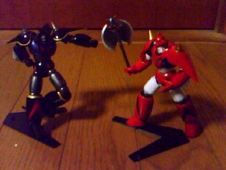 ←赤v.s.黒の対決。“リボルテック ゲッタードラゴン”ホビージャパン誌の限定ブラックヴァージョン。ゲッタードラゴン自体がOVAチェンゲのヤツでございます。で、ブラックverオリジナルで↑レーザーキャノンが付くんですけど…デカイ。保持できなくて重さで下がっちゃうんですけど…。手のひらに両面テープ貼ってみたよ!!でも多分長時間はムリなんだろう。